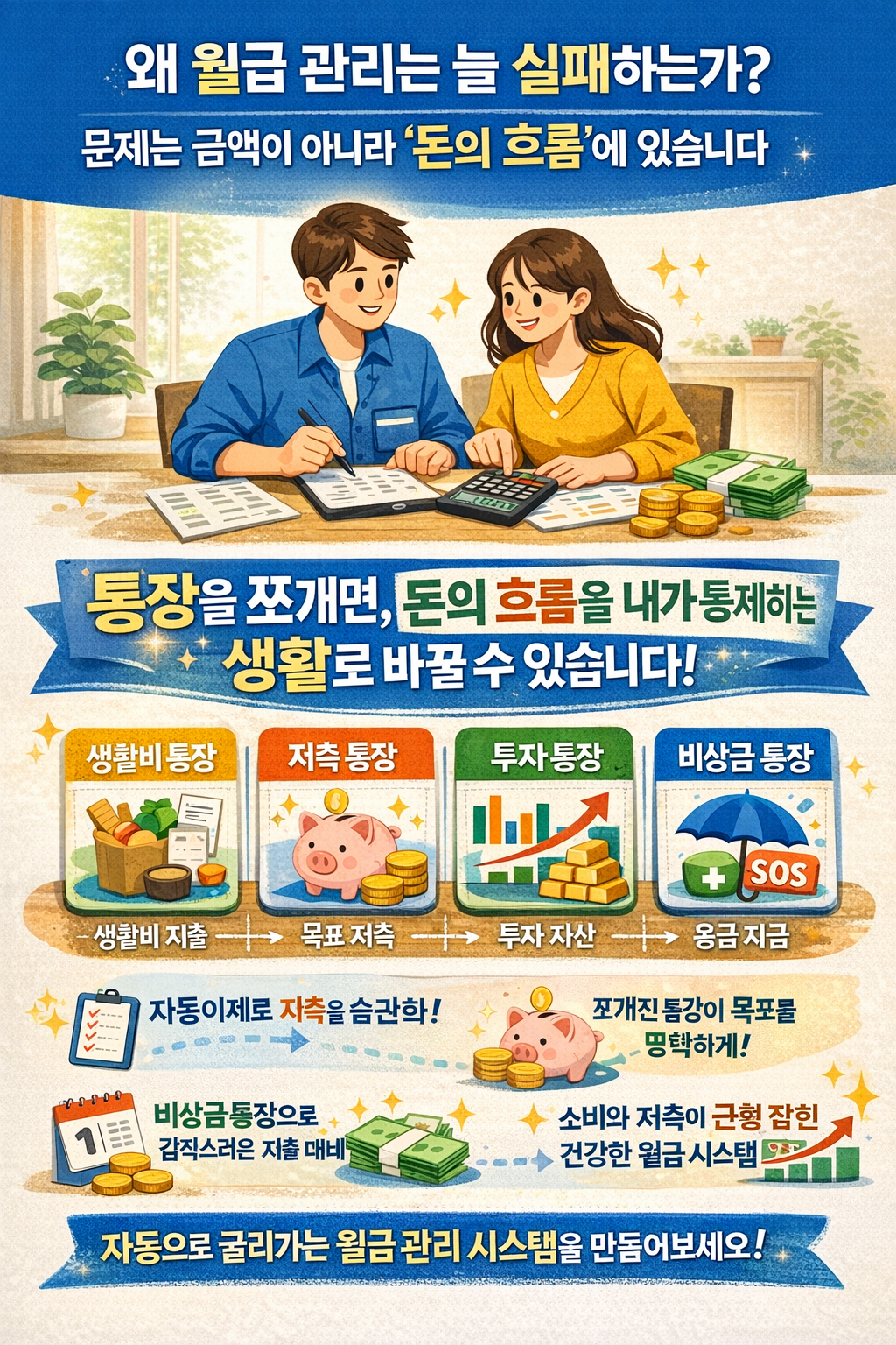이 글은 월급 관리에 자주 실패했던 사람들을 위해 쓰였습니다. ‘의지 부족’이라는 자책 대신, 자동으로 굴러가는 시스템을 만드는 방법을 소개합니다. 작은 변화지만, 반복되면 분명한 차이를 만들어냅니다.